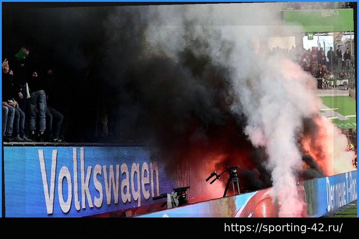 Заголовок информирует о напряженной ситуации, возникшей в немецком городе Вольфсбург после футбольного матча Бундеслиги, в котором местный клуб потерпел поражение от команды «Гамбург» (HSV). После игры на стадионе или в его окрестностях произошли беспорядки, сопровождавшиеся применением пиротехнических средств, что привело к возникновеновению хаотической обстановки.