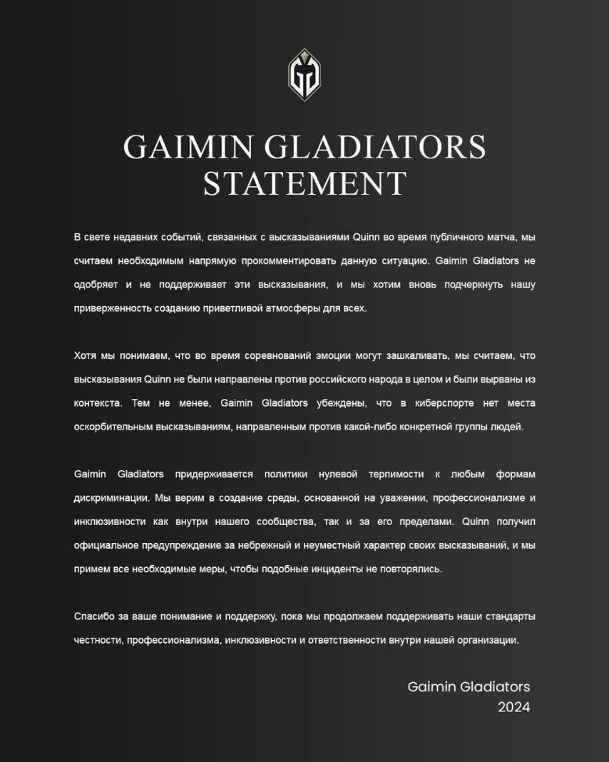 Руководство киберспортивной организации Gaimin Gladiators сообщило, что высказывания их бывшего мидера по Dota 2, Квина Каллахана, известного под никнеймом Quinn, обошлись клубу в сумму, превышающую миллион долларов США в потерянных спонсорских контрактах. Эта информация была раскрыта представителями организации в интервью журналисту Ричарду Льюису.