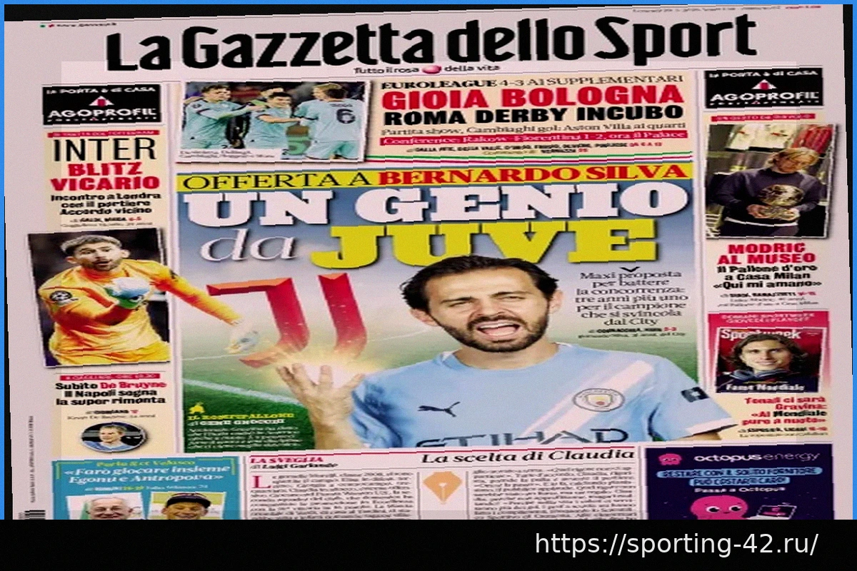 - Ювентус: Предложение Бернарду Силве. «Гений, достойный Юве», — пишет газета. Клубу необходимо перебить конкурентов, предлагая трехлетний контракт с возможностью продления на год игроку, который может перейти бесплатно из Манчестер Сити.