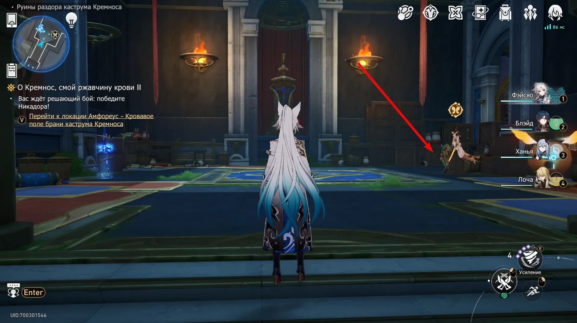 Первый Отголосок находится в верхней части Вечного священного города Охема. Используйте пространственный якорь «Чаша изобилия» и поднимитесь по лестнице, расположенной рядом с телепортом. Пройдите мимо водной завесы к небольшому балкону. Там, у изогнутых перил, вы найдете первый Отголосок. Он посвящен титану Фагусу Кубок Изобилия, богу океанов и штормов, а также покровительнице пиршеств и удовольствий.