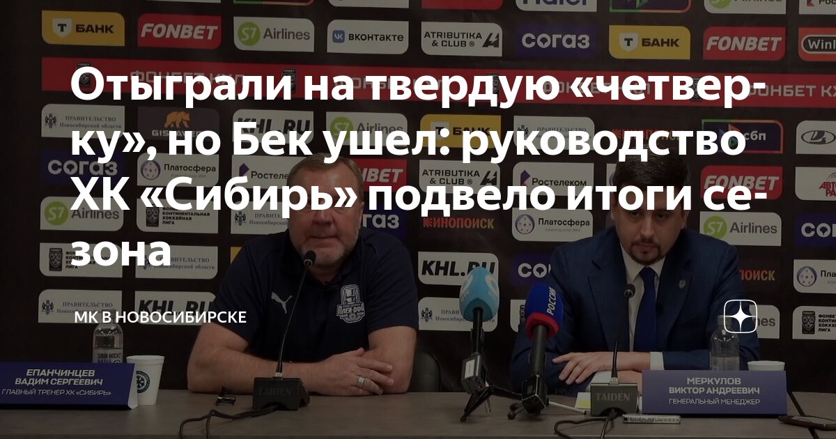 В Новосибирске прошла итоговая пресс-конференция хоккейного клуба «Сибирь», на которой руководство и тренерский штаб представили анализ выступления команды в Фонбет Чемпионате КХЛ сезона 2022-2023. По итогам сезона «Сибирь» заняла седьмое место в Восточной конференции и завершила борьбу в плей-офф в первом раунде, уступив «Салавату Юлаеву» в серии со счетом 3-4. На вопросы журналистов отвечали генеральный директор клуба Лев Крутохвостов, генеральный менеджер Виктор Меркулов, главный тренер Вадим Епанчинцев, а также главный тренер «Сибирских Снайперов» Денис Маскаленко.